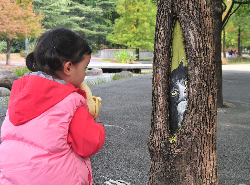 A girl looks at a black cat painted in a tree hole in Shanghai. [Photo/IC]