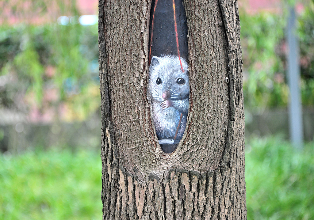 A mouse painted in a tree hole in Shanghai [Photo/IC]