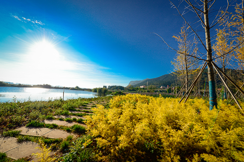 The white clouds reflected on the water complement the golden oriental planes in Wangjiadui Wetland Park in Kunming, Southwest China's Yunnan province. [Photo/IC]