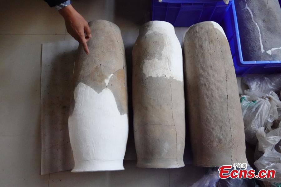 An archaeologist introduces three pottery pipes unearthed in the Haojing site, which was excavated in the current city of Xi'an, Northwest China's Shaanxi province, Nov 18, 2021. [Photo/China News Service]