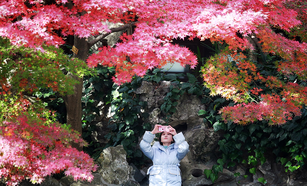 A visitor takes photos of the red maple leaves in the He Garden in Yangzhou, East China’s Jiangsu province. [Photo/IC]