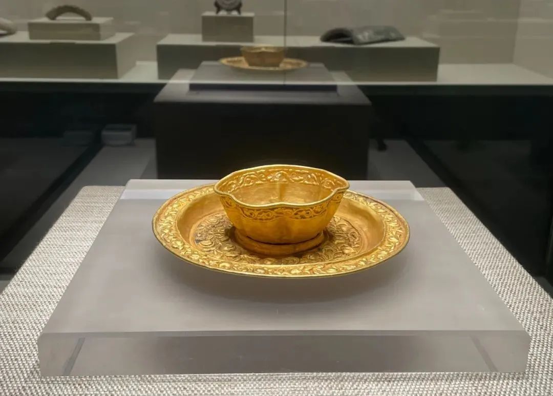Golden cup-and-saucer with chiseled motifs from the Yuan Dynasty (1271-1368), from the collection of the Datong Museum [Photo/Official WeChat account of Mianyang Museum]