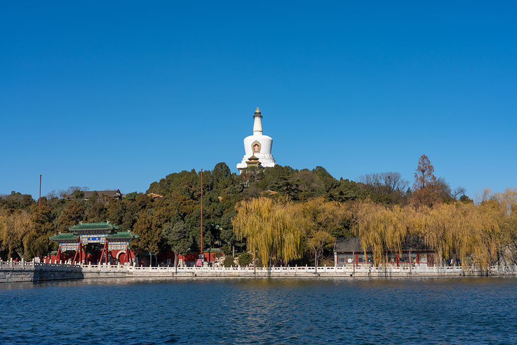 When touring Beijing, don’t forget to visit Beihai Park! In early winter, the iconic white pagoda, yellow willow trees, Wulong Pavilion, and temple form a charming landscape.