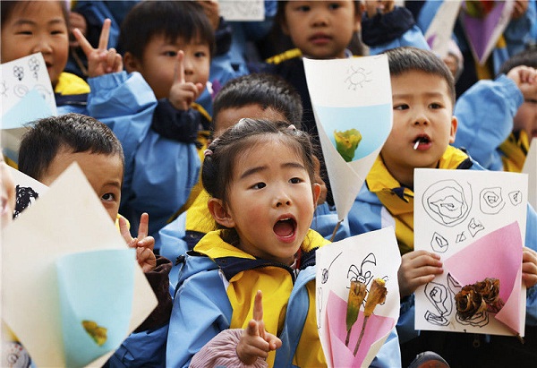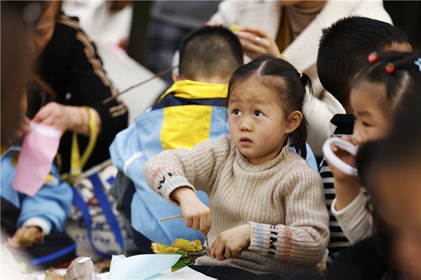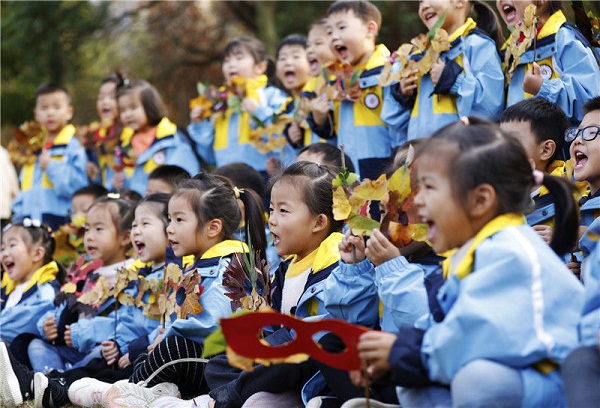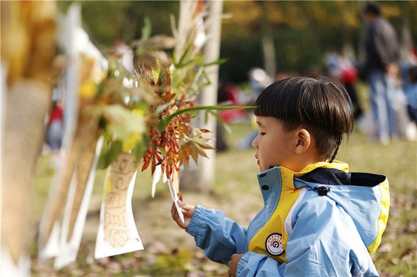 Under the guidance of teachers and parents, kindergarten children adopted a combination of sticking, cutting, and painting methods to make colorful leaf paintings at Jiahe Park in Sihong county, Suqian, Jiangsu province on Nov 2.