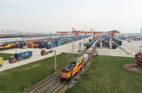 A China-Europe Chang'an freight train departs from Xi'an Port in Xi'an International Trade and Logistics Park. The freight train service is an important channel linking China and Europe. [Photo/en.itl.xa.gov.cn]