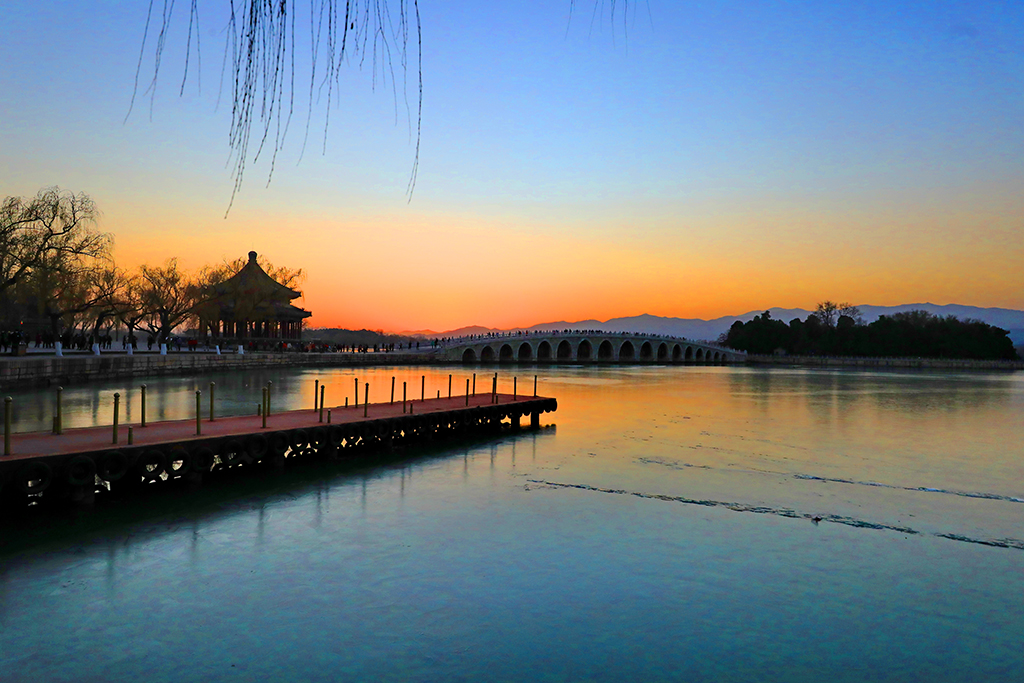 A distant sunset view of Kuoru Pavilion in the Summer Palace in Beijing [Photo/IC]