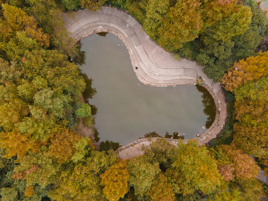 Have you ever seen a heart-shaped lake? In late autumn, a heart-shaped lake in Chengdong Park in Hangzhou, East China’s Zhejiang province is surrounded by colorful trees, which makes it look very romantic.