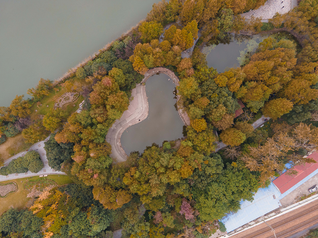 Heart-shaped lake surrounded by colorful trees in E China