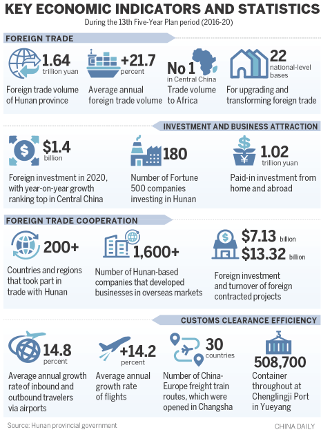 The province has been leading its peers in the middle of the country in further opening-up. This is evidence by an average annual export and import growth rate of 21.7 percent during the 13th Five-Year Plan (2016-20), which ranks first in the country. The value of its foreign trade is expected to exceed 500 billion yuan ($78.27 billion) this year.
