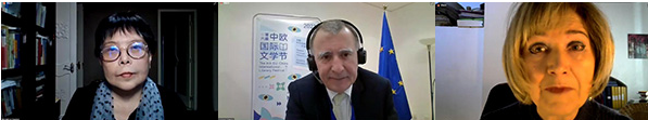 From left: Xu Xiaobin, Nicolas Chapuis and Lidia Jorge, participants of the ongoing 6th EU-China International Literary Festival, speak at the opening ceremony online.[Photo provided to China Daily]
