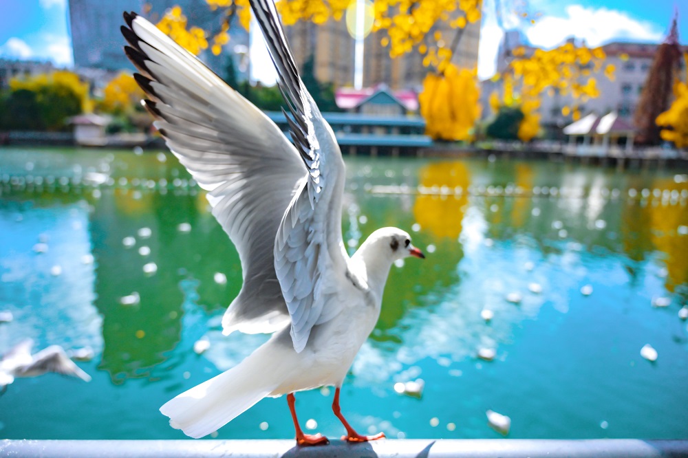 Let’s take a walk and enjoy the warm sunshine! In Kunming, capital of Southwest China’s Yunnan province, the Daguan River gives picturesque winter views with blue skies, white clouds and golden trees in the background. It seems that the birds hovering around think so, too!