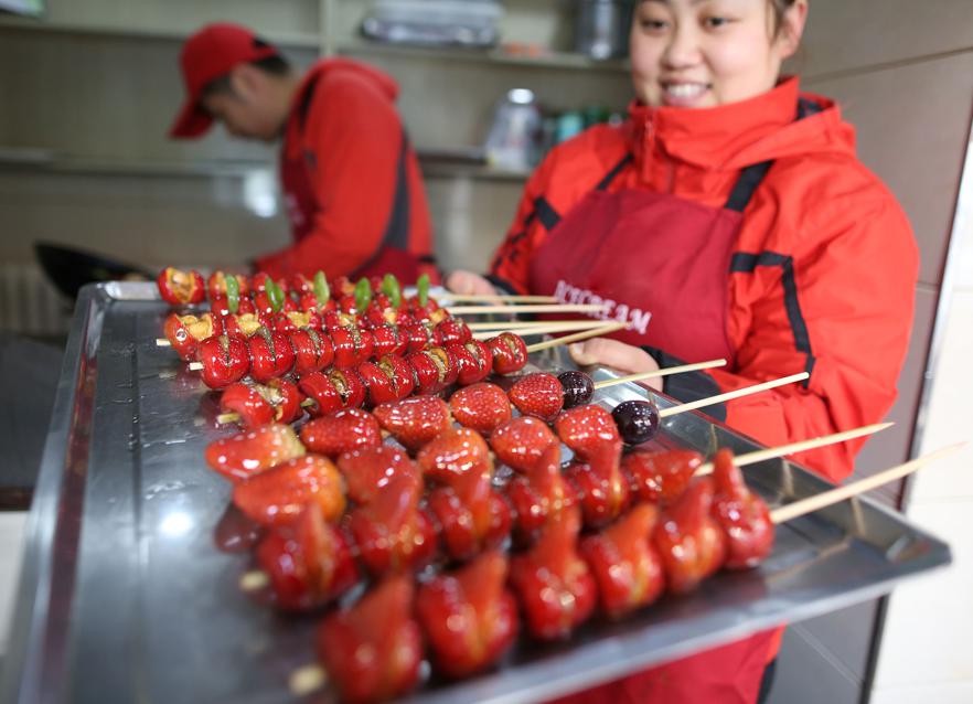 A vendor in Jilin province presents sugar-coated hawthorns. [Photo by Baishi/For chinadaily.com.cn]
