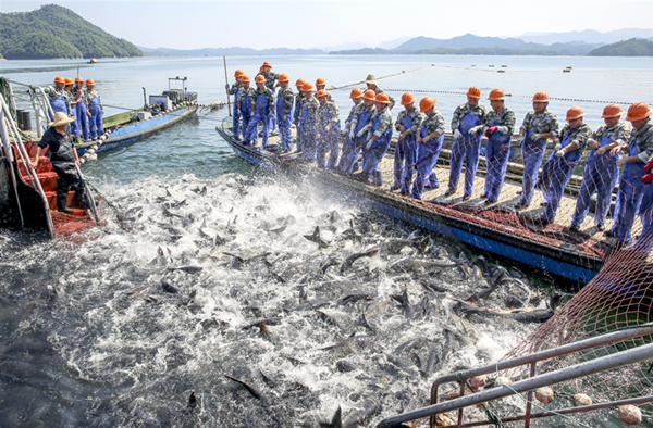 Workers harvest silver and bighead carp on Qiandao Lake in Chun'an, Zhejiang province, on Sept 23. WANG JIANCAI/FOR CHINA DAILY
