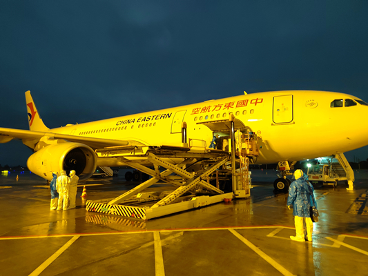 On the initial cargo flight, the cargo consisted of 800 cartons of COVID-19 detection kits manufactured in China, as well as daily necessities like clothes, shoes, and stainless steel products.