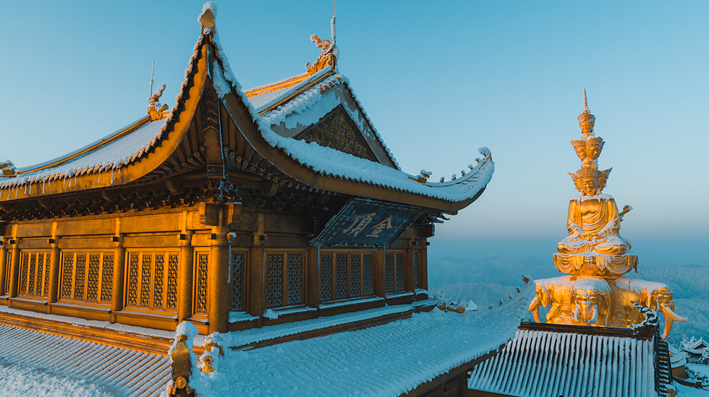 Charming snow-covered landscape seen from Buddhist temple on mountaintop