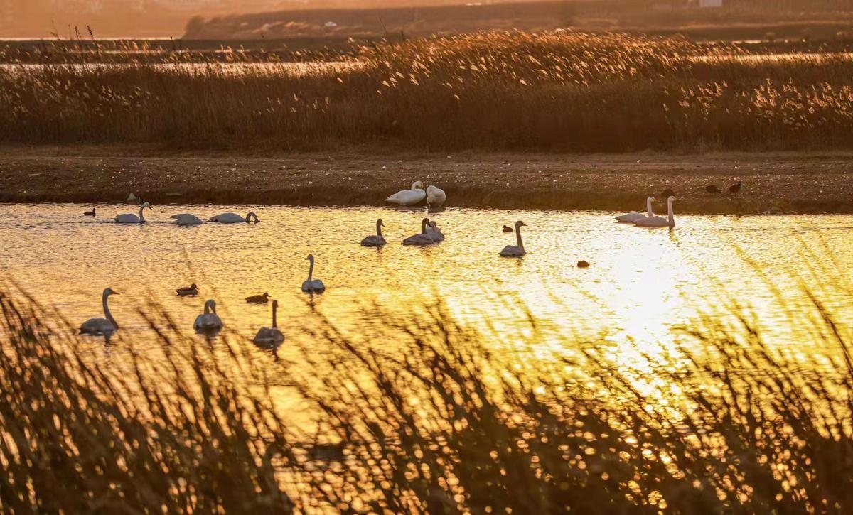 The swans migrate annually from Siberia, the Inner Mongolia autonomous region and China's northeastern regions and stay for around five months at the bay in Rongcheng, making it China's largest winter habitat for whooper swans.