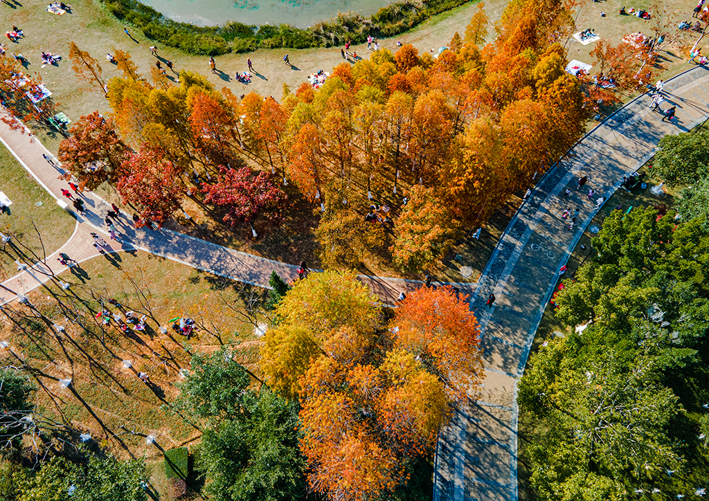 A city park is lit up by bald cypress trees! This park in Ganzhou, East China’s Jiangxi province, is a versatile urban leisure facility that preserves wetland, stores floodwaters and drains waterlogged land.