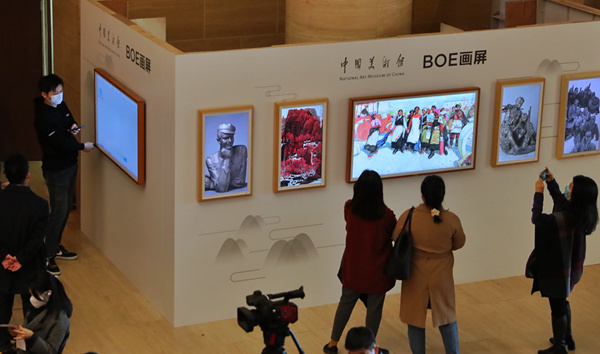 Visitors view high-resolution images of 100 artworks at the National Art Museum of China in Beijing. The museum recently launched a long-term virtual exhibition on the BOE iGallery app, titled 100 Classical Works of Fine Arts in a Century.[Photo by Jiang Dong/China daily]
