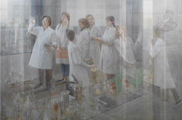 Other pieces present major developments in recent decades, such as Tu Youyou, which is a painting that shows the chemist and Nobel Prize winner and her team working in a lab. Ma Lei, one of the painters, says she and Zhang Caiyi sought to present "a serene, ceremonial atmosphere" in this work to indicate "the long, industrious process of scientific research".
