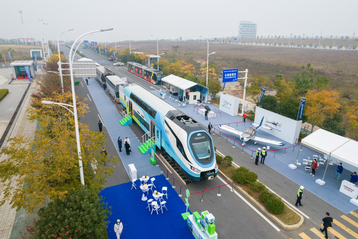 Aerial photo taken on Dec 8, 2021 shows people viewing the exhibits at China International Rail Transit and Equipment Manufacturing Industry Exposition in Zhuzhou, Central China's Hunan province. [Photo/Xinhua]