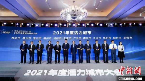 Yantai, Shandong province wins China's dynamic city title at a conference in Guangzhou, Guangdong province on Dec 3. [Photo/chinanews.com]