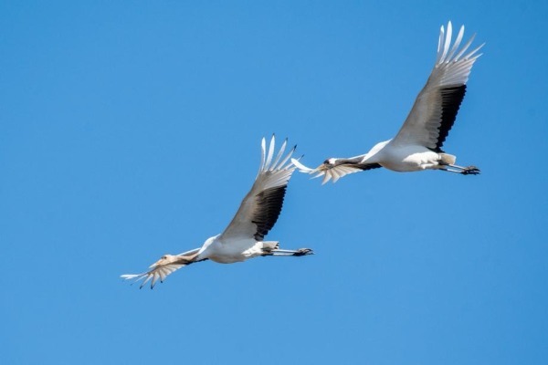 Two red-crowned cranes fly high above Laixi Lake in Qingdao, Shandong province. [Photo by Yun Lin/For chinadaily.com.cn]