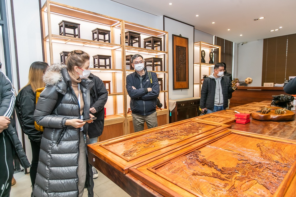 Expats are shown with carved wood panels at Dong Fang Rosewood Museum in Changshu, Jiangsu province. [Photo provided to www.chinaservicesinfo.com]