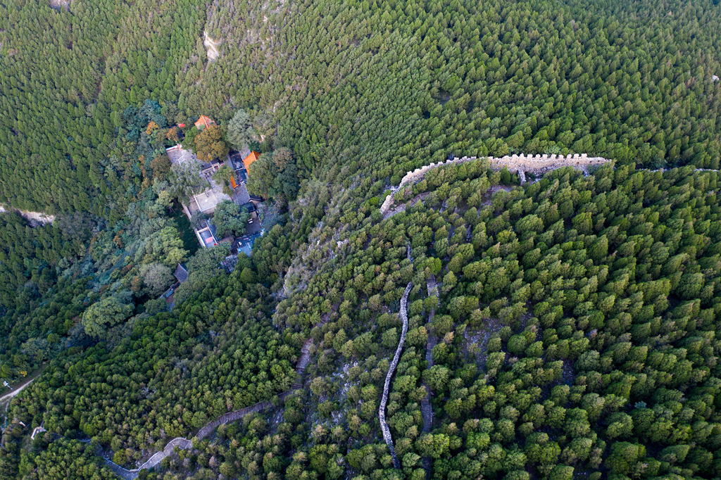 An aerial photo of the Jinyang Pass on the Great Wall that dates back to the State of Qi (1046 - 221 BC), Xueye county, Laiwu, Shandong province. The pass was of such pivotal importance that many historical battles took place in its vicinity. Remnants of the Jinyang Pass section are in different conditions. About 600 meters of the pass is fairly complete.