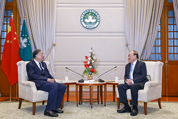 During his stay in Macao, Ma respectively met with Ho Iat-seng, chief executive of the Macao SAR, and Ao Ieong U, secretary for social affairs and culture of Macao.