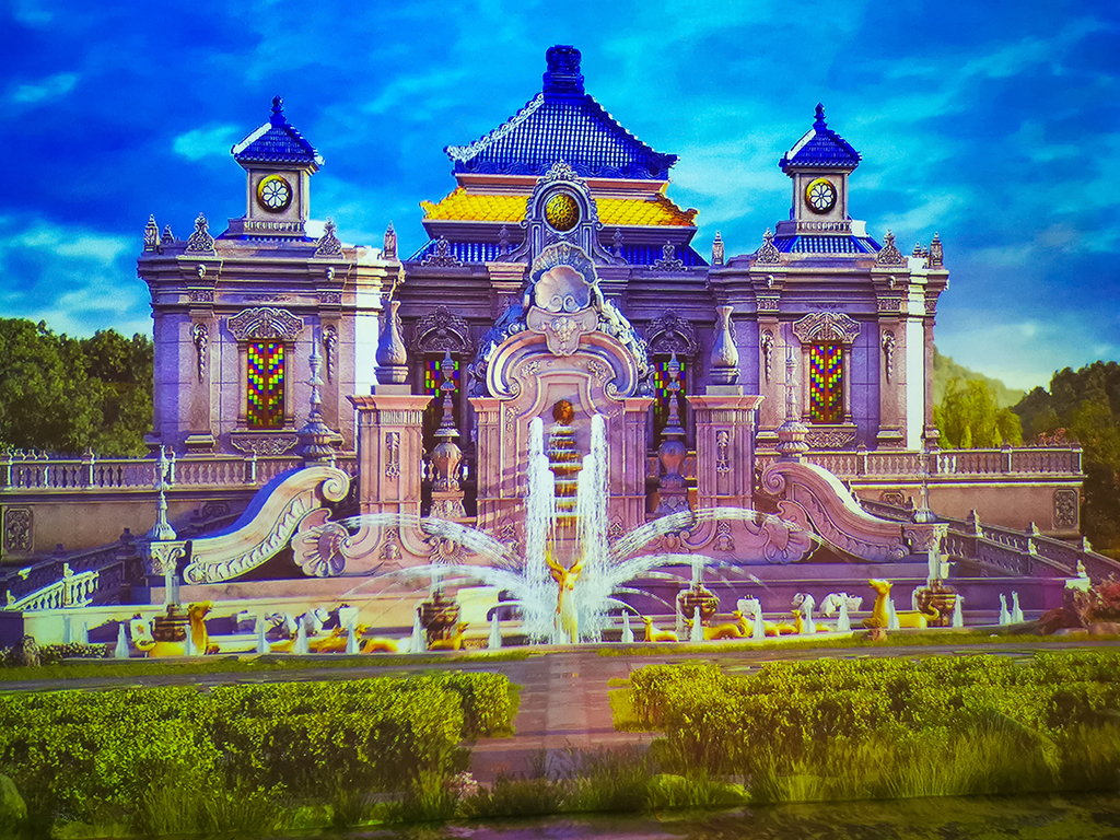 The grand scenery of the Great Fountain Dashuifa at the Old Summer Palace (Yuanmingyuan Park) in Beijing is restored with the help of light and shadow technology. [Photo/IC]
