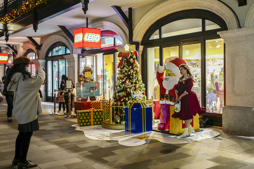 A woman poses for a photo with a Santa Claus Lego statue in Disneytown at Shanghai Disney Resort. [Photo/IC]