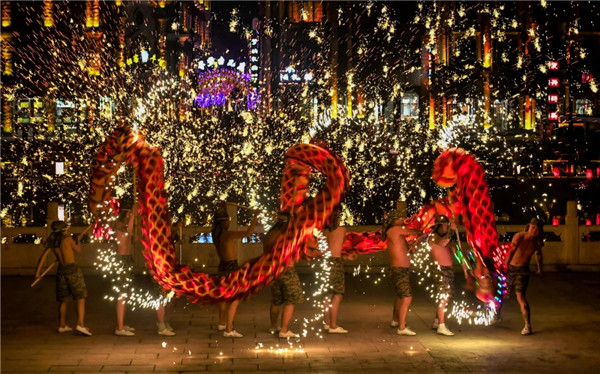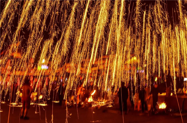 "Fireworks" created by sparks from molten iron dazzle tourists in Taierzhuang Ancient Town, Zaozhuang, East China's Shandong province. [Photo/WeChat account: tezgc2008]