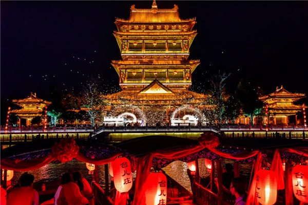 Taierzhuang Ancient Town looks like a dreamworld after dark when the city is illuminated with colorful lights. [Photo/WeChat account: tezgc2008]