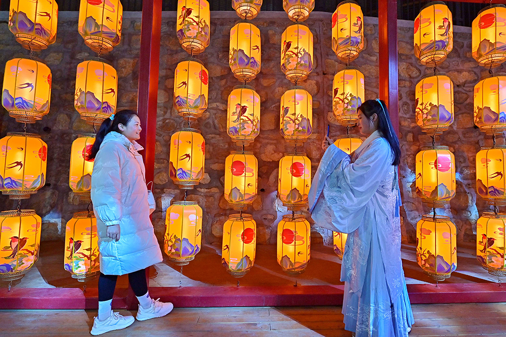 A woman poses for a photo with lantern lights in Qingzhou Ancient City Tourist Area in Weifang, East China’s Shandong province. [Photo/IC]