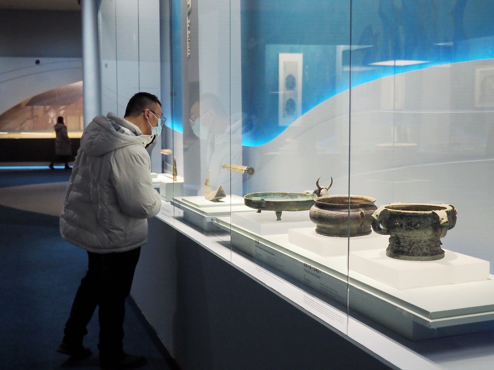 A visitor looks at the bronze exhibits at the National Museum of China. [Photo/IC]