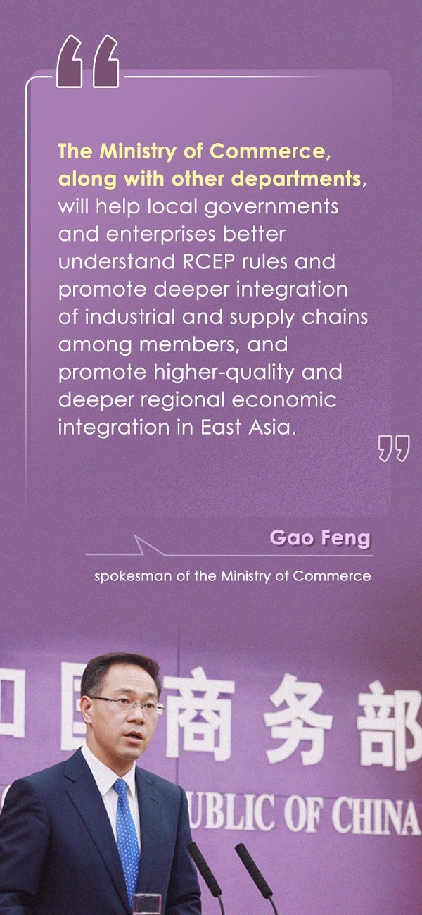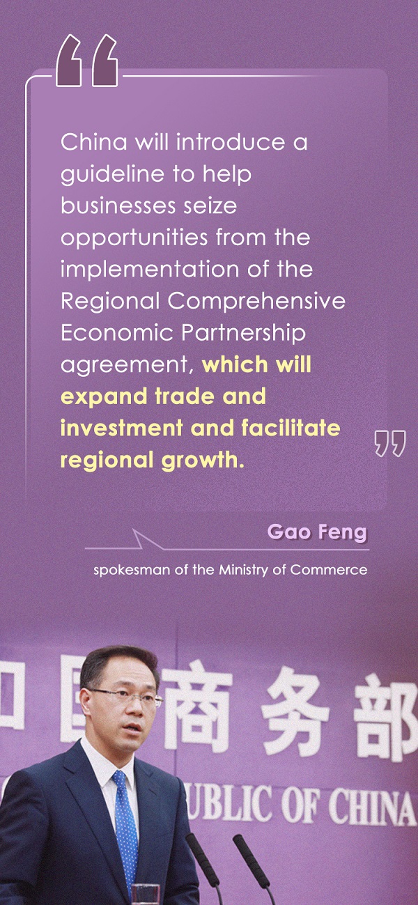Gao Feng, spokesman of the Ministry of Commerce, said at an online media briefing on Thursday, "The ministry will roll out a guideline for high-quality implementation of the agreement together with other departments, aiming to help enterprises and local governments to make better use of RCEP rules and seize opportunities from markets opening up wider."