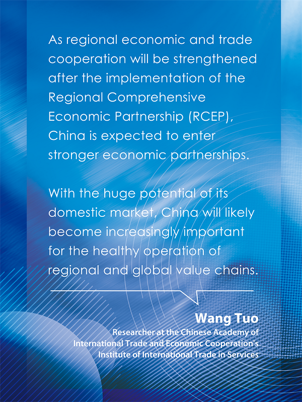 Wang Tuo, a researcher at the Chinese Academy of International Trade and Economic Cooperation's Institute of International Trade in Services, said as regional economic and trade cooperation will be strengthened after the implementation of the RCEP, China is expected to enter stronger economic partnerships.
