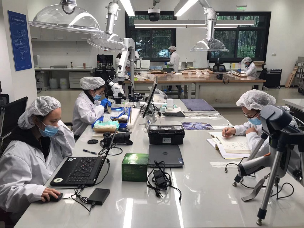 The conservators at the Sanxingdui Cultural Relics Protection and Restoration Hall at work to restore the relics. [Photo/IC]