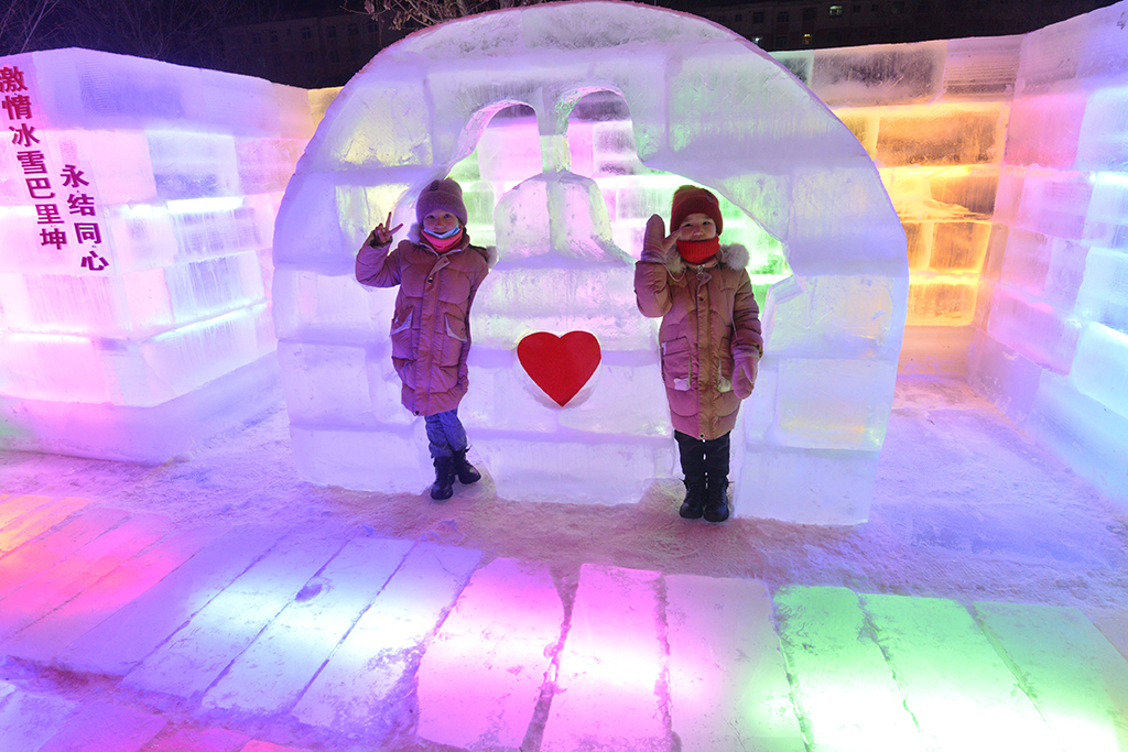 Children pose for photos with an ice sculpture in Barkol Kazak autonomous county, Hami prefecture, Xinjiang Uygur autonomous region. [Photo/IC]
