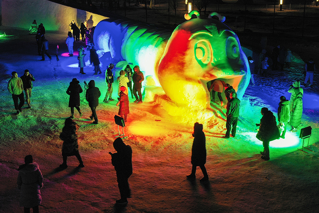 A snow sculpture lights up at night at the 17th ice and snow cultural tourism festival in Barkol Kazak autonomous county, Hami prefecture, Xinjiang Uygur autonomous region. [Photo/IC]