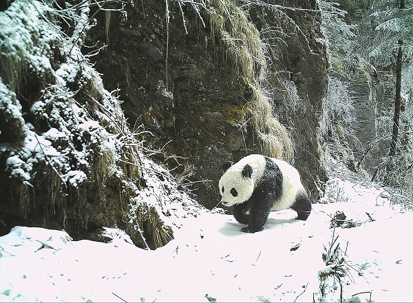 An infrared camera captures a giant panda in the Xiaozhaizigou area of the Giant Panda National Park in Sichuan province on March 1. [Photo/Xinhua]