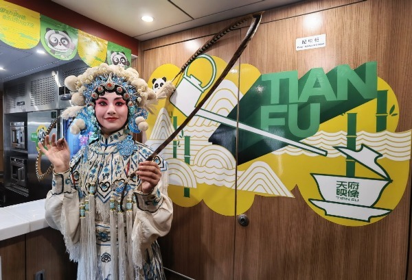 A staff member wearing a Sichuan opera costume greets passengers on a bullet train painted with images of local cultural elements at Chengdu East Railway Station in the city of Chengdu, Sichuan province, on Nov 25, 2021. [Photo/China News Service]