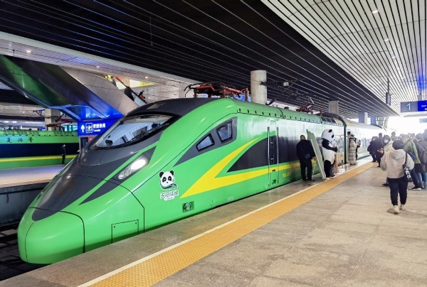 A bullet train painted with images of local cultural elements stops at Chengdu East Railway Station in the city of Chengdu, Sichuan province, on Nov 25, 2021. [Photo/China News Service]