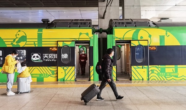 Passengers walk past a bullet train painted with images of local cultural elements at Chengdu East Railway Station in the city of Chengdu, Sichuan province, on Nov 25, 2021. [Photo/China News Service]