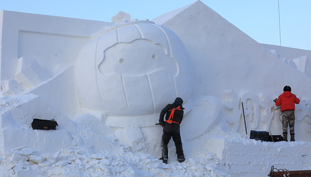 The snow sculpture of the mascot of Beijing 2022 Olympic Winter Games "Shuey Rhon Rhon" in the Stalin Park in Harbin, Northeast China’s Heilongjiang province [Photo/IC]