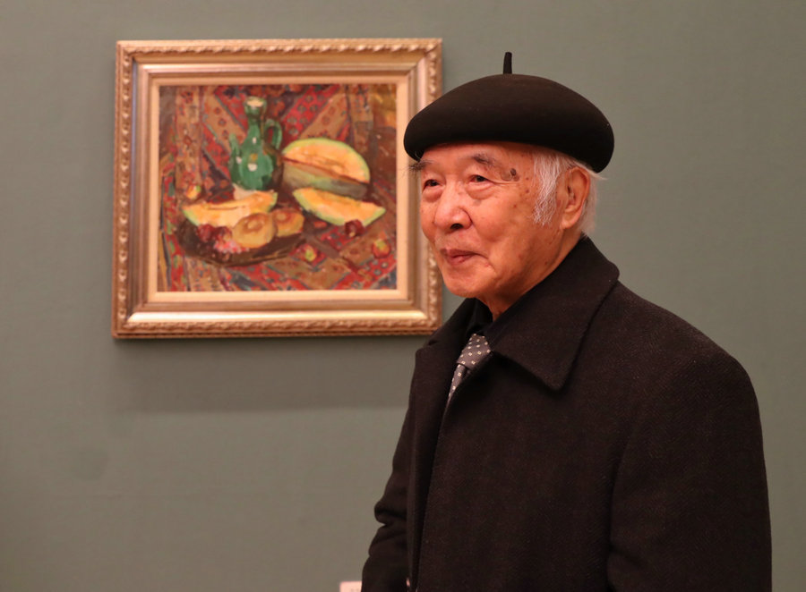 Eminent painter Xu Minghua at his solo exhibition at the National Art Museum of China. [Photo by Jiang Dong/China Daily]