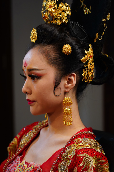 Peaches color the cheeks; eyebrows on fleek. A golden bird pinned; a jade hairpin waving in the wind. With the veteran skills of makeup artist Sun Aina, the peerless Tang Dynasty (618-907) imperial concubine returns to the modern era in the dance drama Li Bai.
