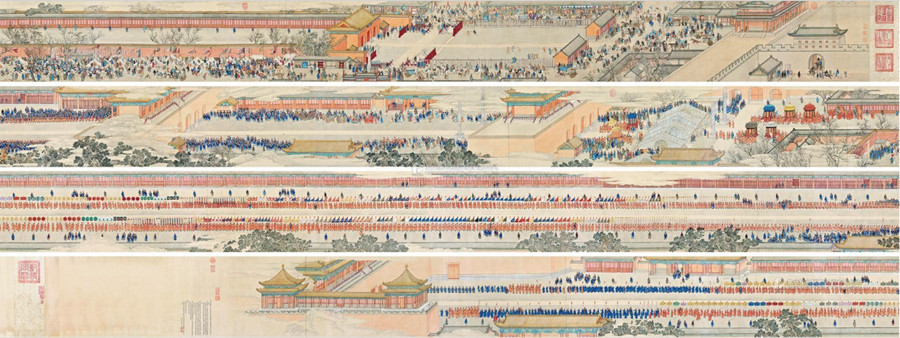 The painting, 42 cm long and 1,800 cm wide, is created by Xu Yang, an imperial court painter of the Qing Dynasty. It depicts a historical moment using a realistic technique, featuring another masterpiece of court painting during the Qianlong period of the Qing Dynasty.
