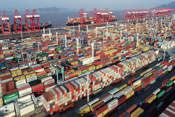 An aerial photo taken on Nov 11, 2021 shows containers piled up at Ningbo Zhoushan Port. [Photo provided to chinadaily.com.cn]
