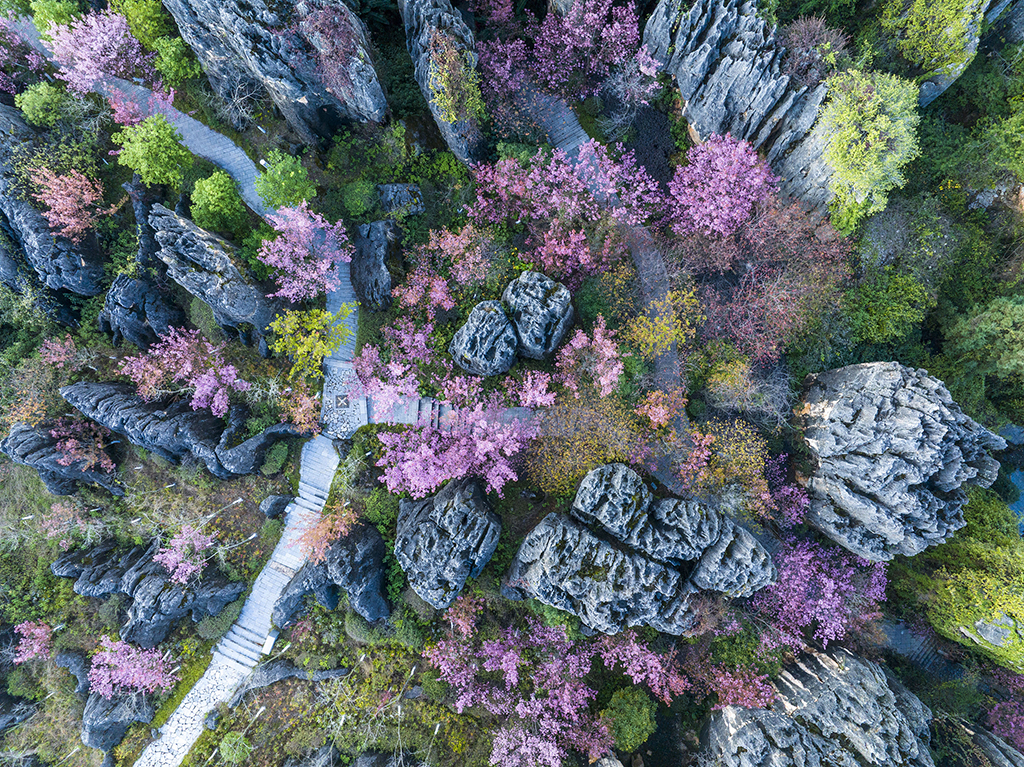 Pink cherry blossoms in the Stone Forest Scenic Area in Kunming, Southwest China’s Yunnan province [Photos/IC]